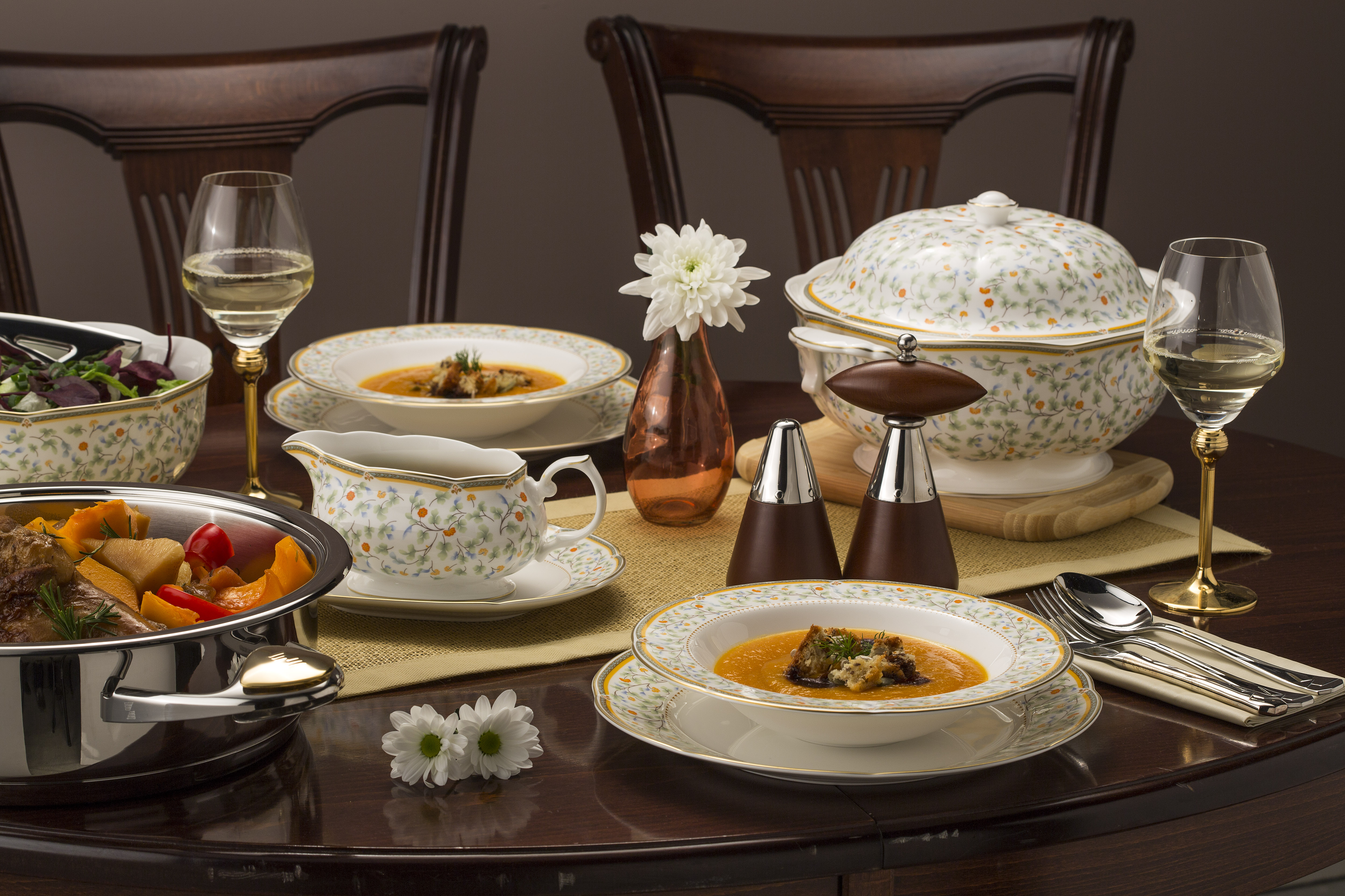 Красиво расписанная коллекция фарфора Флора придаст романтический стиль любой трапезе. Сочные цвета и изящный цветочный узор, расписанный тонкими золотыми линиями в сочетании с признанным качеством продукции Zepter. Cервиз выразит трепетные чувства во время любой трапезы и будет действительно великолепным подарком.
